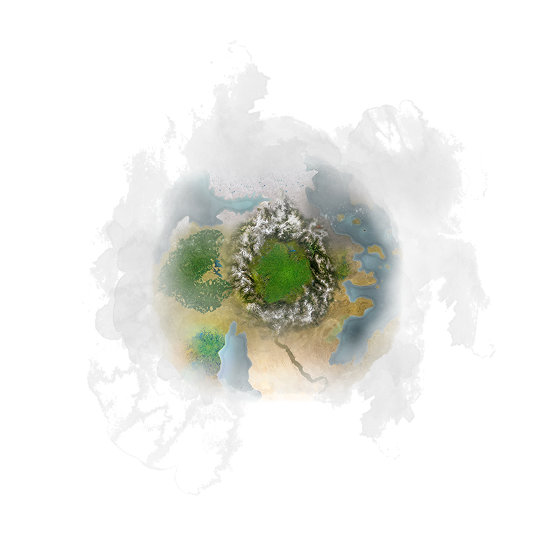 Top-down surface of the central Yester, Boundary Peaks, the eight Lands, misty Afterwhiles, and edge Vestiges.